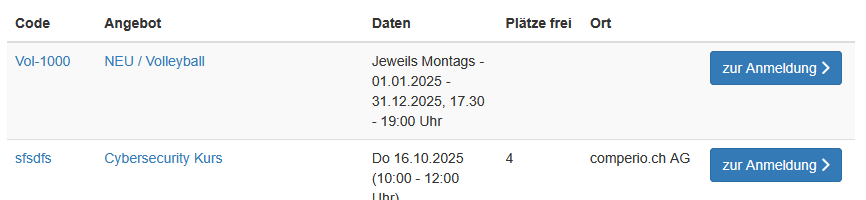 Hie wurde beim ersten Angebot (Volleyball) "Neu" hinzugefügt". Beim zweiten Angebot (Cybersecurity Kurs) ist kein Kategorie Titel (Frontend) erfasst worden: