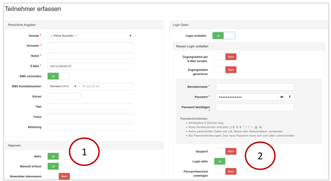 Wenn Sie einen Teilnehmer erfassen und die Funktion «Login erstellen» aktivieren, haben sie 2 «aktiv» Funktionen. Ist auf der linken Seite (1) «Aktiv» auf Ja gesetzt, bedeutet dies, dass die Teilnehmerin anmelden kann.