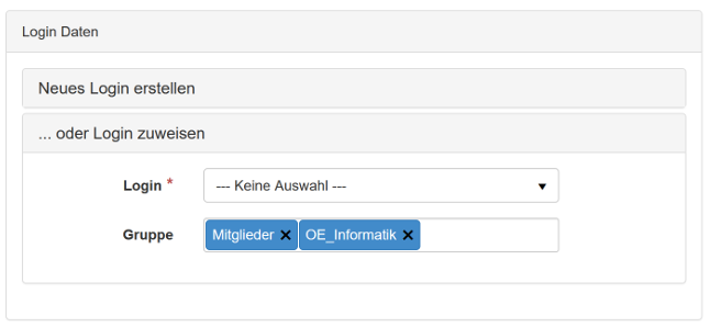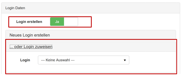 Falls die Teilnehmerin, der Teilnehmer bereits besteht, ist die Funktion in der Lasche «Logindaten» vorhanden. Auch hier können Sie ein Login erstellen oder das Login zuweisen: