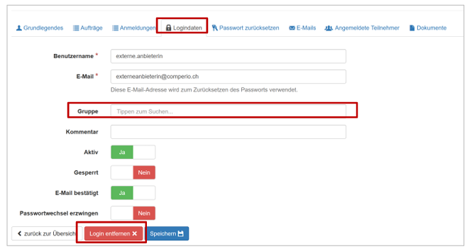 Gehen Sie zum Teilnehmer unter Logindaten und entfernen Sie das Login. Wichtig dabei ist, dass Sie zuerst allfällige Rollen im Bereich «Grundlegendes» entfernen. Diese können nach erneuter Zuweisung des Logins wieder hinzugefügt werden.