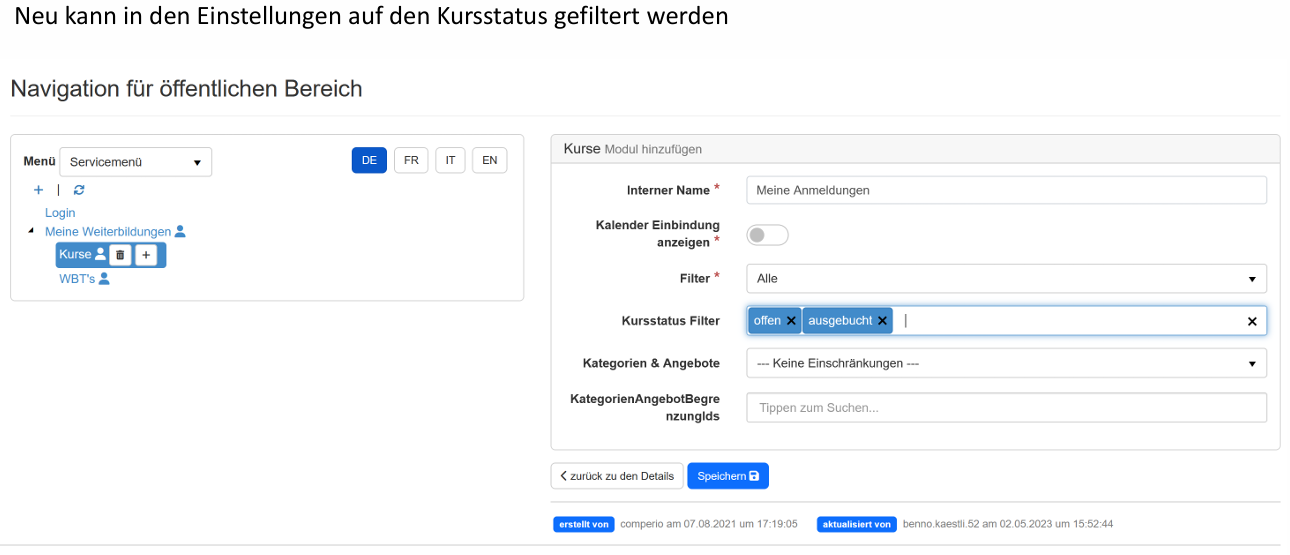 - Für die Module "Meine Anmeldungen" und "Meine angemeldeten Teilnehmer" kann neu in den Einstellungen auf den Kursstatus gefiltert werden.