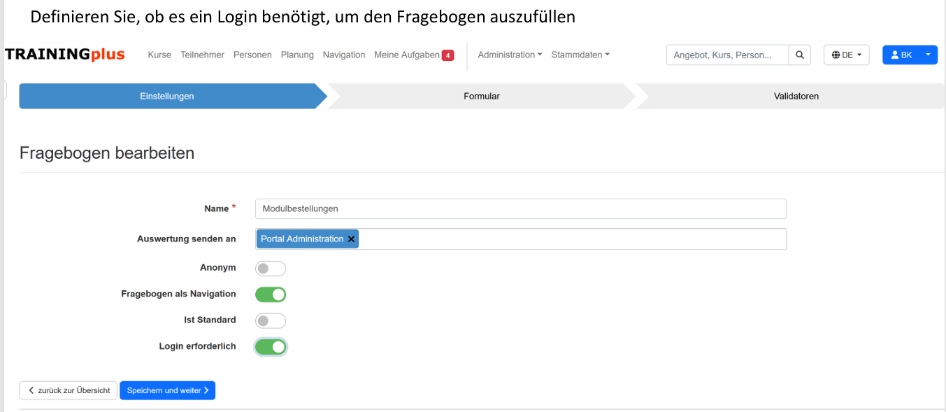 - Bei den Fragebogen kann per Einstellung definiert werden, ob ein Login notwendig ist