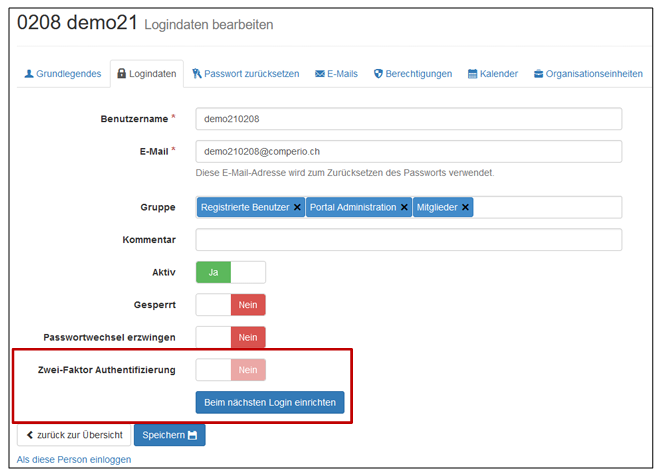 Falls die 2-Faktor-Authentifizierung pro Person nutzen wollen, können Sie bei den gewünschten Personen unter «Logindaten» die 2-Faktor Authentifizierung aktivieren. Wählen Sie dafür die Funktion «Beim nächsten Login einrichten». So muss die entsprechende Person die 2-Faktor Authentifizierung beim nächsten Login selber einrichten.