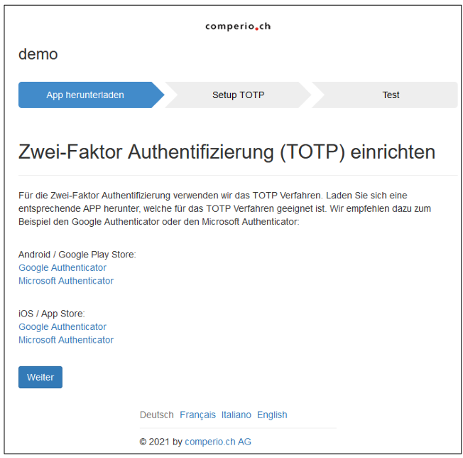Es wird eine App auf dem Handy benötigt, um das TOTP-Verfahren zu nutzen. TOTP bedeutet: Time-based One-time Password Algorithmus, siehe https://de.wikipedia.org/wiki/Time-based_One-time_Password_Algorithmus. Hier erhält er die Informationen und die Links, zu den bekanntesten Authenticator Lösungen von Google und Microsoft: