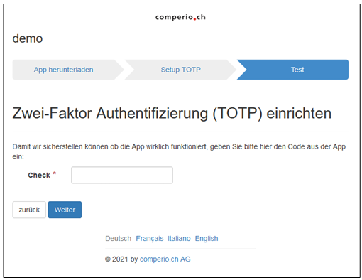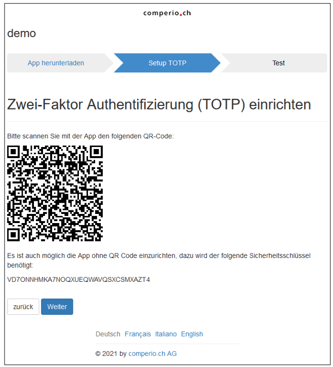 Die Personen, welche sich im Backend einloggen wollen und die 2-Faktor Authentifizierung aktiviert ist, werden bei der Einrichtung geführt. Hier zur Info die einzelnen Schritte. Nach erfolgreichem Login kommt die Person auf eine separate Seite für die Einrichtung: