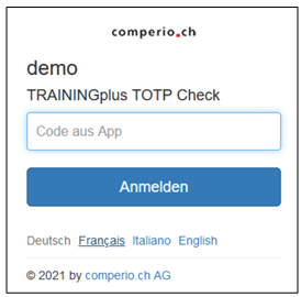 Nun ist die 2-Faktor Authentifizierung aktiv und die Personen erhalten nach erfolgreichem Login die Aufforderung, den Code aus der App jeweils einzugeben. Erst mit dieser zweiten Authentifizierung gelangen die Personen ins TRAININGplus: