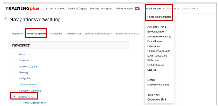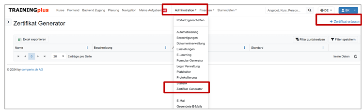 Aktivieren Sie unter «Administration» - «Portal Eigenschaften» - «Portal Navigation» im Bereich Administra tion den Zertifikat Generator:
