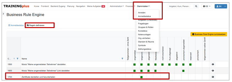 Nicht vergessen, ob ein Zertifikat dargestellt wird oder nicht, definieren Sie beim Anmeldestatus. Unter «Stammdaten» - «Anmeldestatus» können Sie bei den «Regeln definieren» einstellen, wann das Zertifikat dargestellt werden soll: