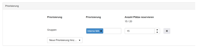 Diese Funktion erscheint nur, wenn eine Maximal Teilnehmerzahl definiert wird. Dann können Sie basierend auf Kriterien wie z.B. Gruppen», entsprechende Plätze reservieren. Dies bedeutet, dass in untenstehendem Beispiel 15 Plätze der 20 Plätze für interne Mitarbeitende reserviert sind. Sobald also 5 Personen, welche nicht dieser Gruppe zugehören, sich angemeldet haben, können sich keine anderen Gruppen ausser der Gruppe «Interne MA» anmelden.