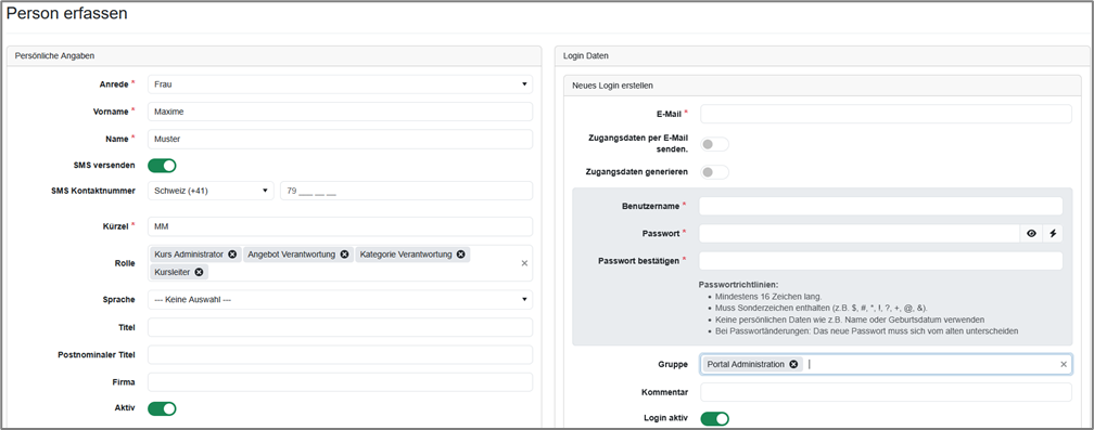Erfassen Sie unter «Personen» die Verantwortlichen und geben Sie diesen die entsprechende Rolle. Den Portal Administrator definieren Sie unter «Gruppe».