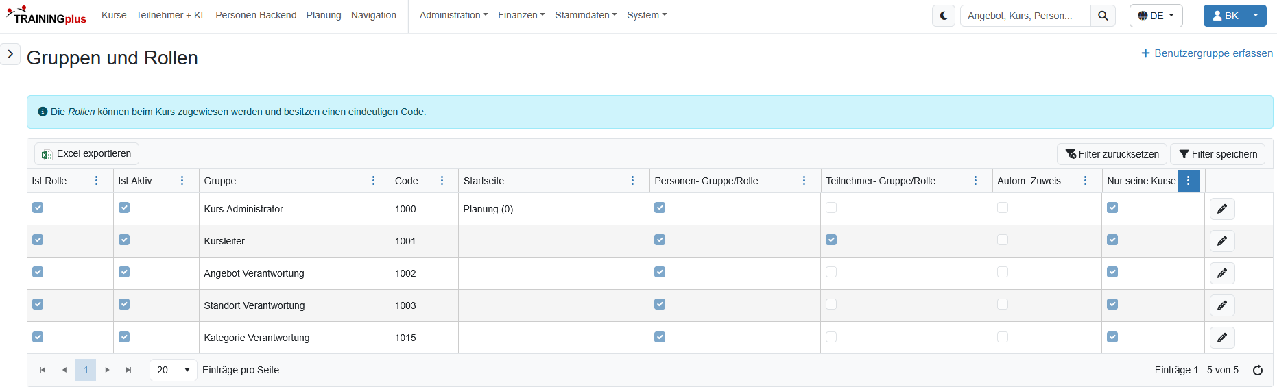 Unter Stammdaten - Gruppen&Rollen definieren Sie nun, dass die jeweiligen Rollen nur Ihre Kurse sehen dürfen: