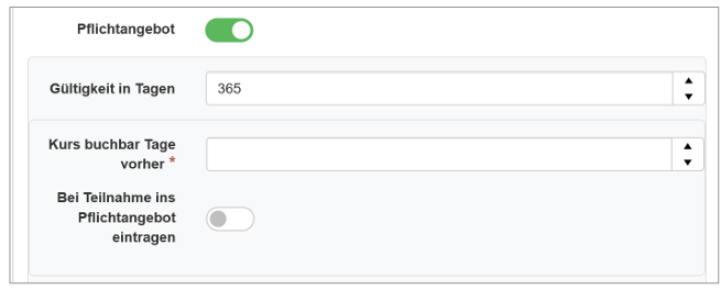 In einem ersten Schritt definieren Sie, ob ein Angebot ein Pflichtangebot sein soll oder nicht. Dies wird auf der Ebene Angebot erfasst: Sobald Sie ein Angebot als Pflichtangebot definieren, können sie angeben, nach wievielen Tagen das Ange bot wieder besucht werden soll und wie viel Tage vor Ablauf es für die Mitarbeitenden buchbar ist: