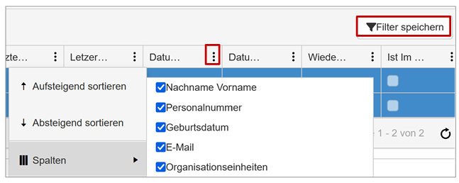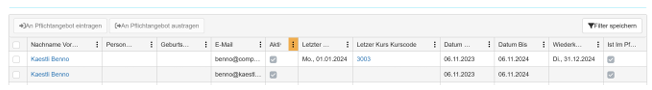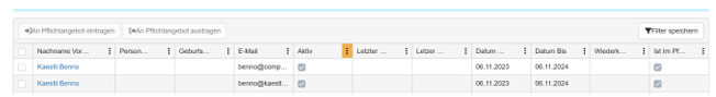 Nachdem Sie auch die Kurse erfasst haben, können Sie die Mitarbeitenden dem Pflichtangebot zuweisen. Im Register Pflichtangebot erscheinen alle Mitarbeitenden. Nutzen Sie die Filterfunktion und insbesondere die Spalte Organisationseinheit, sofern Sie diese aktiv nutzen. Die Ansicht mit den Spalten können Sie über die Funktion «Filter speichern» speichern: