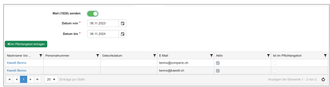 Nach der Bestätigung «An Pflichtangebot eintragen» wird die E-Mail versendet (falls aktiviert) und die Mit arbeitenden sind im Pflichtangebot eingetragen. Wichtig zu wissen ist, dass der Mitarbeitende nicht automatisch angemeldet wurde und er/sie sich nun basierend auf dem Mail an einem der verfügbaren Kurse anmelden soll.