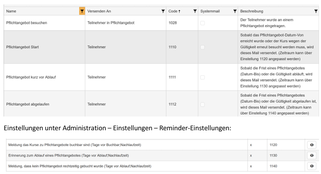 Mit dem Pflichtangebot sind verschiedene Mails verfügbar. Beachten Sie, dass diese Mails aktiv sind und die Einstellungen gemäss Beschreibung definiert werden: