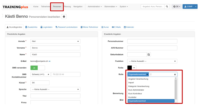 Erfassen Sie unter Personen die Verantwortlichen der Organisationen und weisen Sie diesen Personen die Rolle «Organisationseinheit» zu: