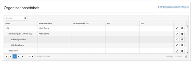 Sie können die Struktur eigenständig definieren. Sofern sie Unterbereiche definieren wollen, wählen Sie als «Oberorganisationsheit» den gewünschten Eintrag. Die Felder Externe ID sowie Min und Max werden für individuelle Funktionen verwendet. Diese können sie leer lassen. Nun können Sie als Verantwortlicher eine der Person auswählen, der Sie die Rolle «Organisationseinheit» zugewiesen haben. Sie haben auch die Möglichkeit mehrere Stv. Zu definieren.