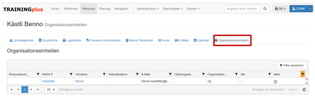 Mit der Zuweisung sind nun verschiedene neue Ansichten verfügbar. In der Administration unter «Personen» sehen Sie nun die Lasche «Organisationseinheiten» und es werden alle Personen dargestellt, die die ser Organisationseinheit zugewiesen wurden.