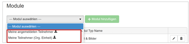 Sofern die Person auch als Teilnehmer erfasst ist und das gleiche Login besitzt, können sie diesen Nutzern auch im Frontend mit den folgenden Modulen die Anmeldungen, resp. die Mitarbeitenden darstellen lassen.