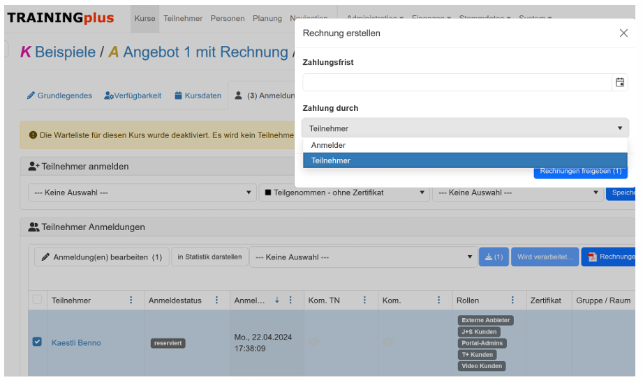 - "Zahlen muss" kann beim Freigeben der Rechnung gesetzt werden, ob Teilnehmer oder der Anmelder bezahlt