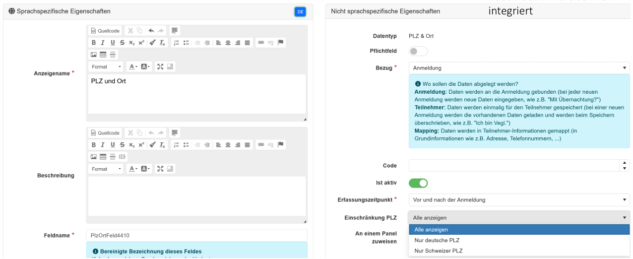 - Beim FormGen Datentyp "PLZ & Ort" gibt es neu die Möglichkeit ob alle PLZ dargestellt werden sollen oder nur deutsche oder Schweizer PLZ