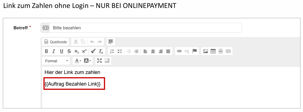 - Neu können Aufträge ohne Login bezahlt werden, in dem der Platzhalter "{{Auftrag Bezahlen Link}}" dem Teilnehmer zugestellt wird