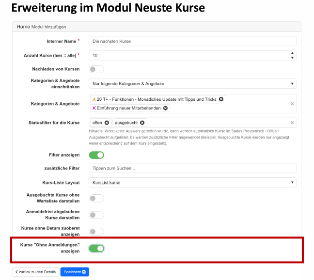 - Im "Neuste Kurse"-Modul gibt es neu die Option ob Kurse mit der Option "ohne Anmeldungen" dargestellt werden sollen