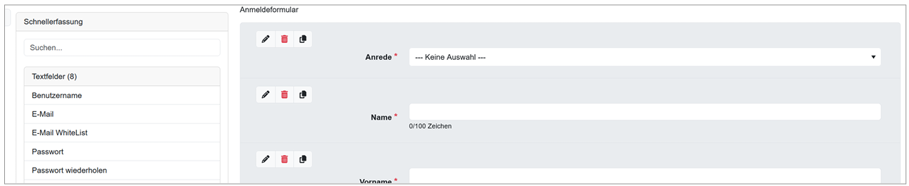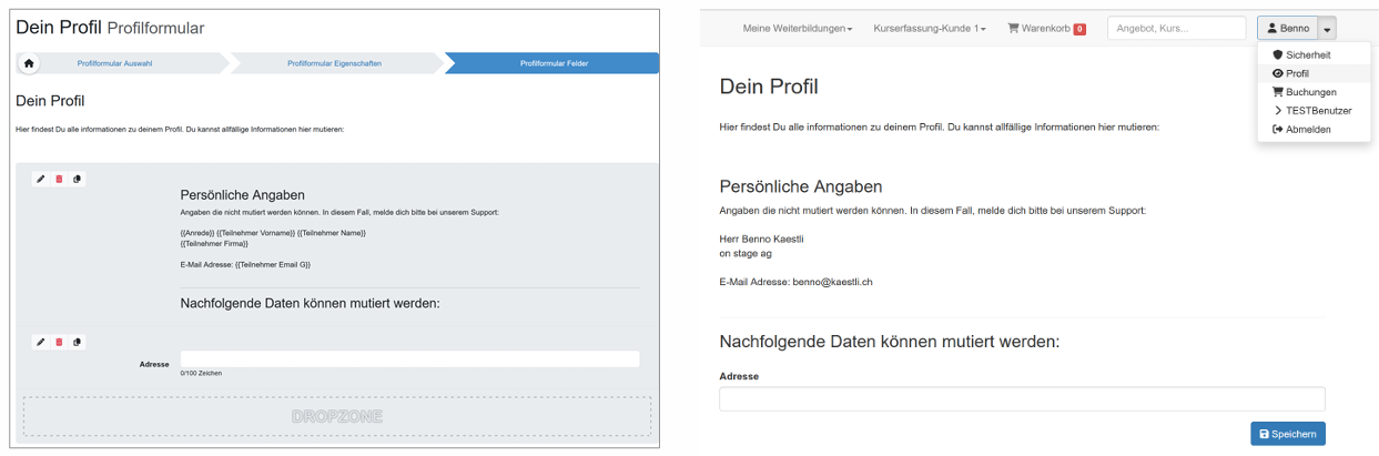 Falls ein Login vorhanden ist, kann mit diesem Feature dem Teilnehmenden die Möglichkeit gegeben werden, Basisdaten selbst zu mutieren. Dazu gibt es im Formulargenerator einen Formular Typ „Profilformular“