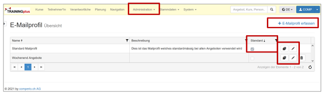 Unter Administration – E-Mailprofile finden Sie die vorhandenen Profile und können eigene Profile erstellen.