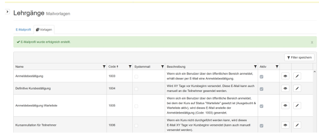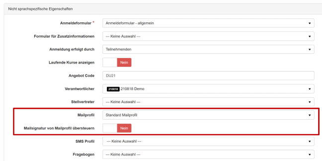 Mit den Mailprofilen können Sie unterschiedliche Texte den verschiedenen Beteiligten bei einem Kurs zu weisen. Ein Mail besteht jeweils aus einem Text und einer Signatur. Entsprechend können diese beiden Elemente separat verwaltet werden. Nach Erstellung des Mailprofils kann dieses dem jeweiligen Angebot zu gewiesen werden.