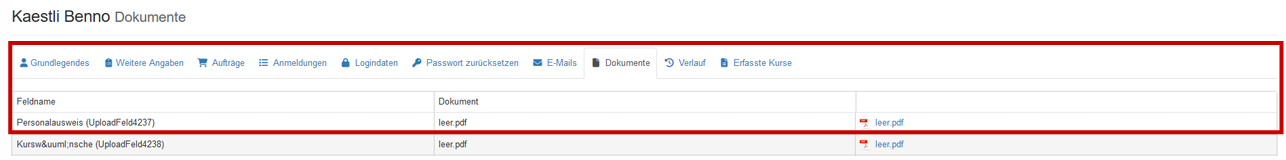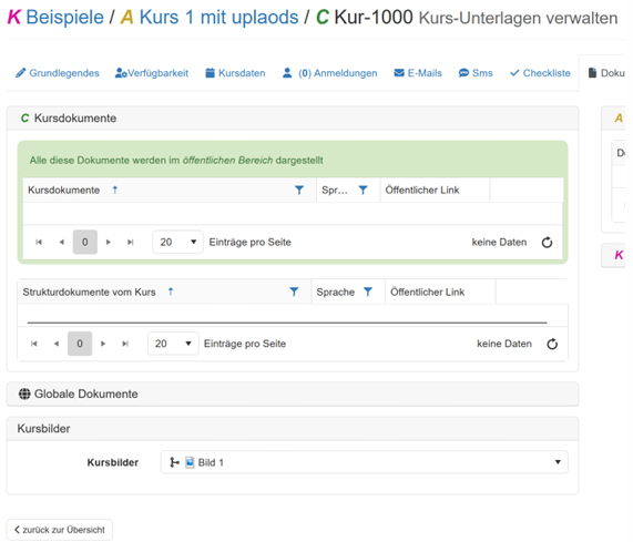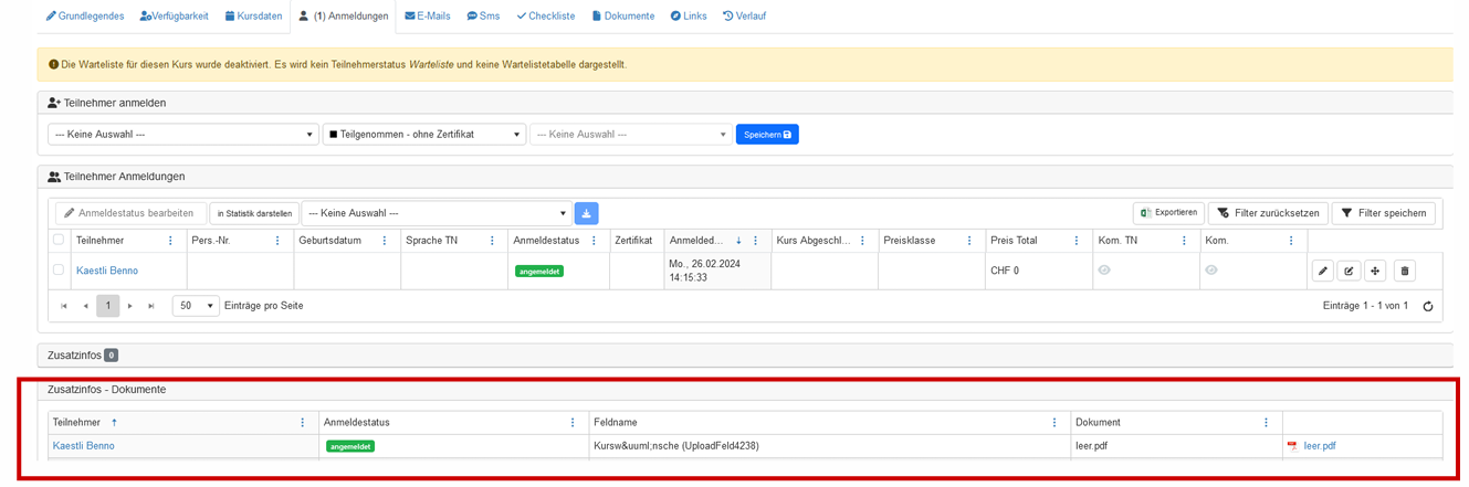 - Unter Kurs/Anmeldungen sind jetzt in einem separaten Panel die hochgeladenen Dokumente ersichtlich