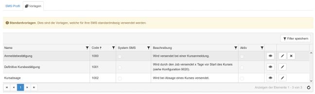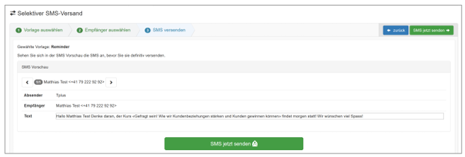 Wir empfehlen Ihnen, die SMS «Definitive Kursbestätigung» sowie die Kursabsage aktiv zu setzen und die Texte, wie Sie es bei den Mails kennen, anzupassen. Untenstehend haben wir die «Definitive Kursbestätigung» gleich in «Reminder» umgetauft: