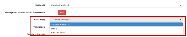 Bei den Angeboten müssen unterhalb des Mailprofils, das SMS-Profil auswählen. Da kein Standard definiert wurde, muss nun bei den gewünschten Angeboten, die einen SMS Reminder benötigen, das gewünschte Profil ausgewählt werden: