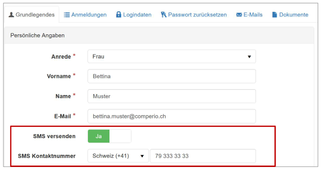 Bei den Teilnehmern müssen die Werte SMS versenden aktiviert sein und bei der SMS-Kontaktnummer ein Eintrag vorhanden sein: