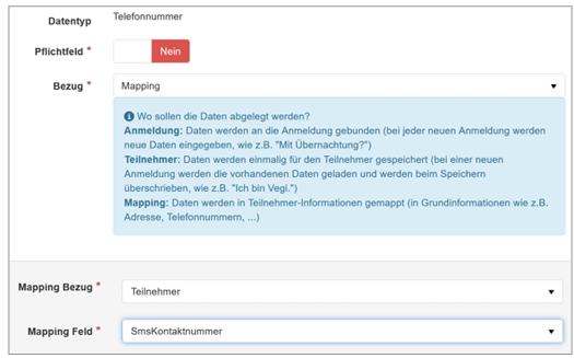 Um dies zu garantieren, muss beim Anmeldeformular das Telefonnummer auf die Person mit dem Wert SMS-Kontaktnummer gemappt werden: