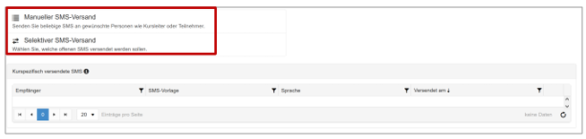 Der Versand von SMS funktioniert identisch wie bei den Mails. Die SMS sind im jeweiligen Kurs unter «Mails», unter halb der Maileinstellungen vorhanden. Sie können auch manuelle SMS versenden oder die Funktion «Selektiver Mailversand» nutzen.