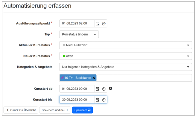 Hier ein Beispiel, wo der Kursstatus in einer Kategorie mit Kursen vom September von «nicht Publiziert» auf «offen» am 1. August 2023 um 02:00 Uhr gesetzt wird.