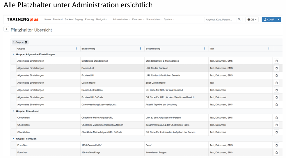 - Platzhalter sind ab sofort unter „Administration“ – „Platzhalter“ alle ersichtlich 3
