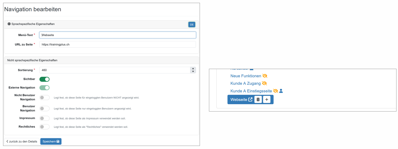 - Bei einer Navigation kann gewählt werden, ob es sich um einen internen oder externen Link handelt