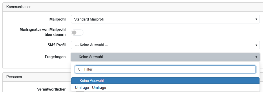 Der Fragebogen kann nun beim Angebot bei der Kommunikation zugewiesen werden: