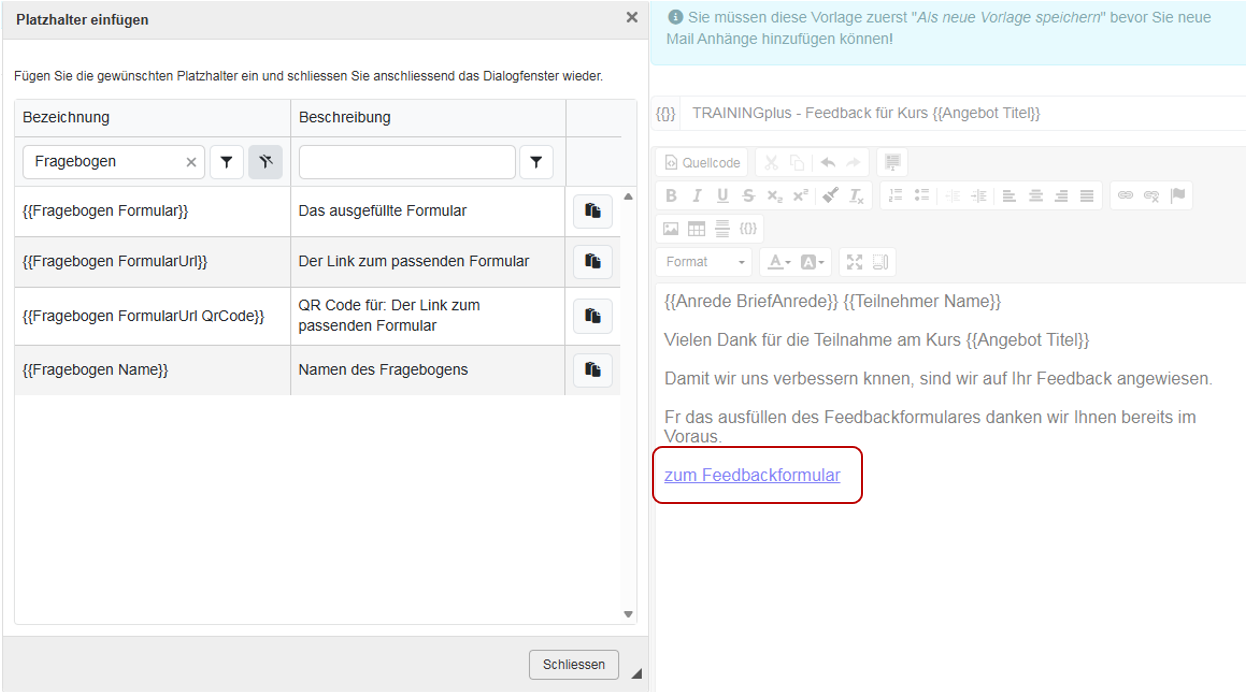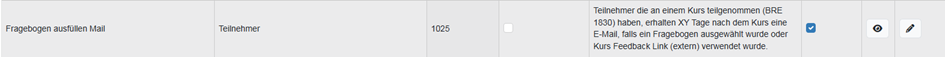 Nach Abschluss des Kurses kann der Platzhalter für den Fragebogen unter Administration – E-Mail – Mail-Code 1025 eingefügt werden.